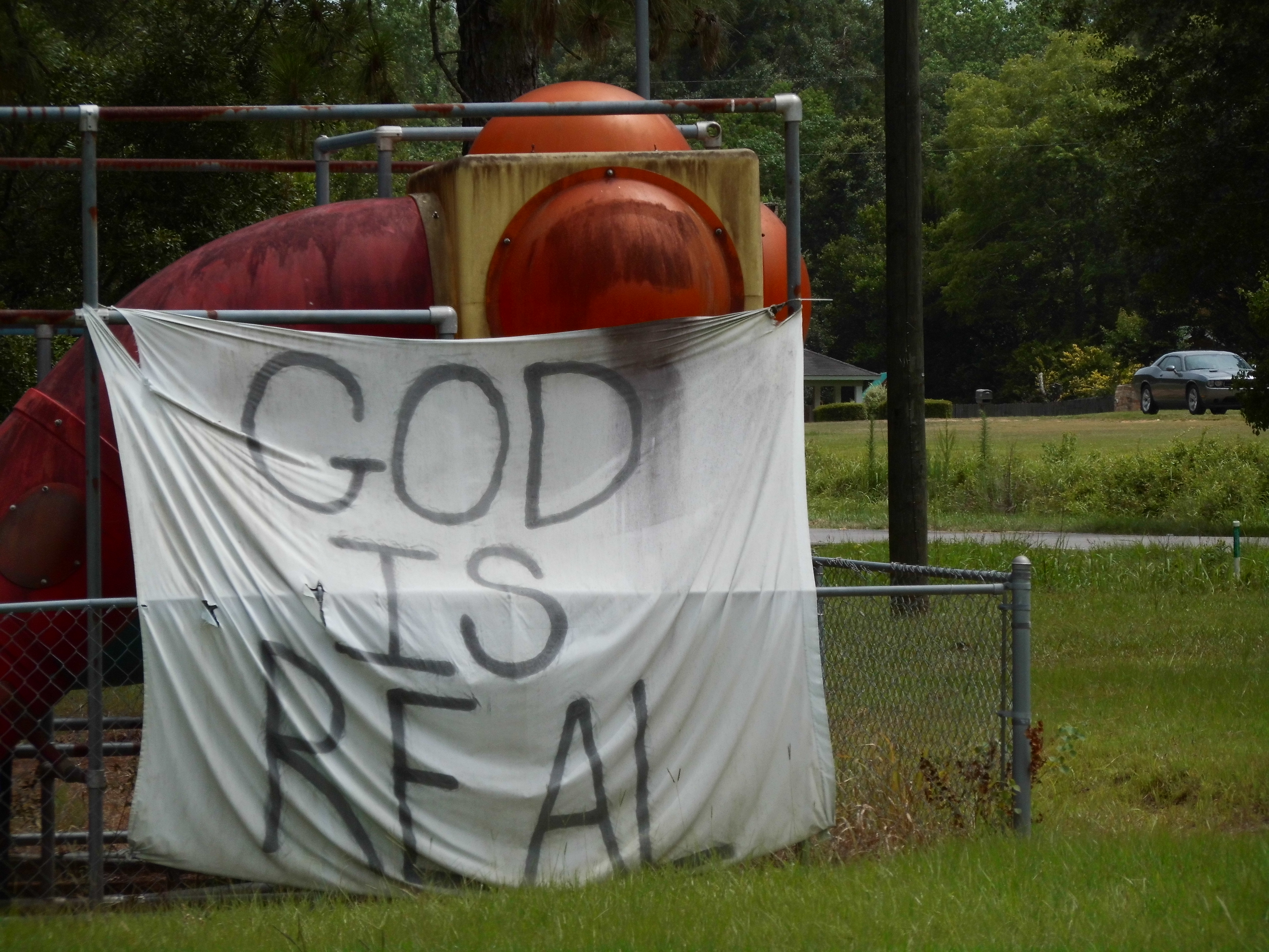 Someone hung up white sheets at several locations in my community. Each one was spray painted with the same message: “God is Real.” I saw three of them, but there could have been more. Those just happened to be on the roads I frequently use.