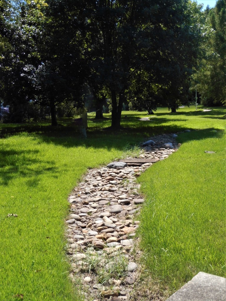 In the movie Finding Nemo, Gil (the angelfish) says, “All drains lead to the ocean.” It’s a romantic thought that served its purpose well in the movie, but technically not true. I’m afraid if Nemo and friends had followed the drain I saw, they would have died on the rocks of a dry creek bed or flopped around in the muddy grass in front of a bronze boy with a fishing pole.