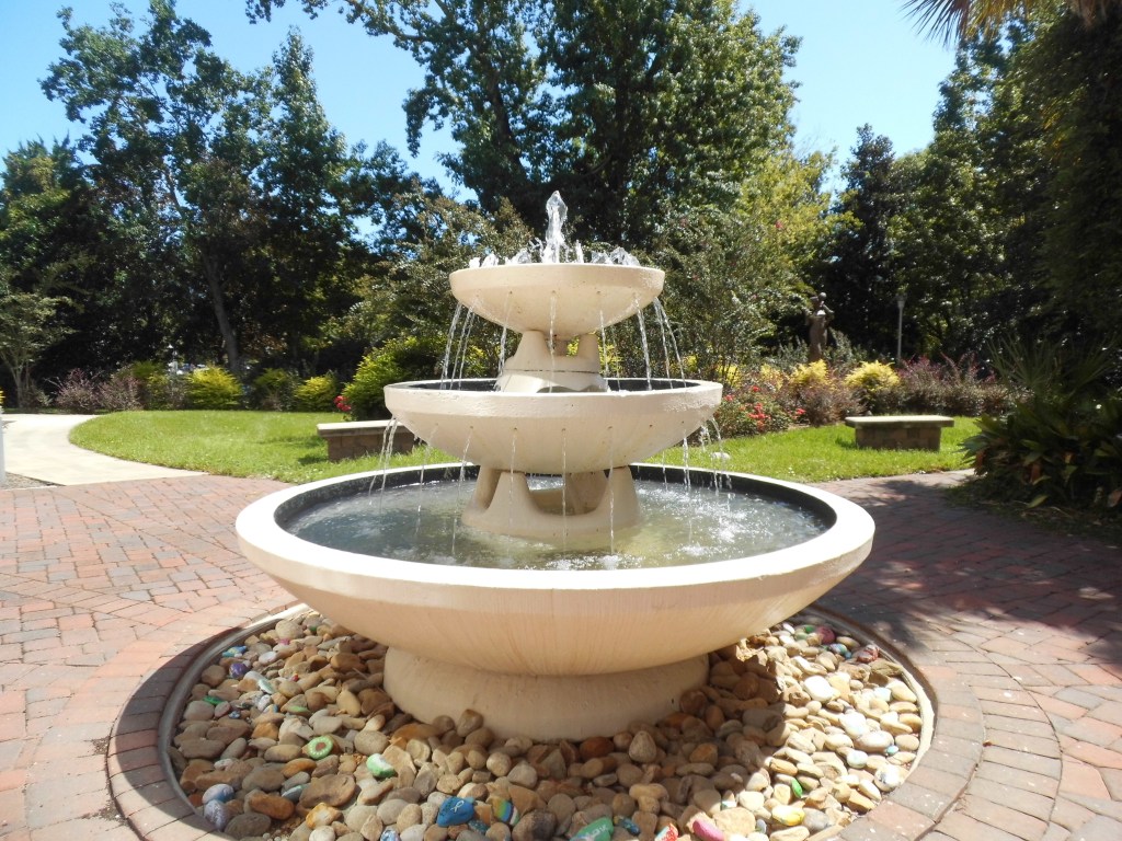 On a recent visit to a lovely urban park, filled with dozens of bronze statues, I saw this artificial creek, used as a setting for one of the art pieces. Varying sizes of rocks are placed to show the meandering pattern of a stream. It ended in an area of lush grass that I, unfortunately discovered was really mushy and wet. As I wiped the mud from my sneakers, I saw the origin of the artificial creek was a large concrete drain pipe. I wish I’d noticed that before venturing across the field. I might have stayed on the walkway.