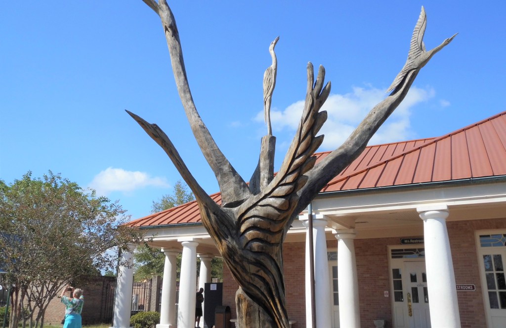 One of the Mississippi Welcome Centers displays beautiful wood carvings by Marvin and Preston Miller. They are famous for turning 50 dead oaks, destroyed by Hurriane Katrina, into lively art. Many are along Highway 90 through Biloxi-Gulfport.