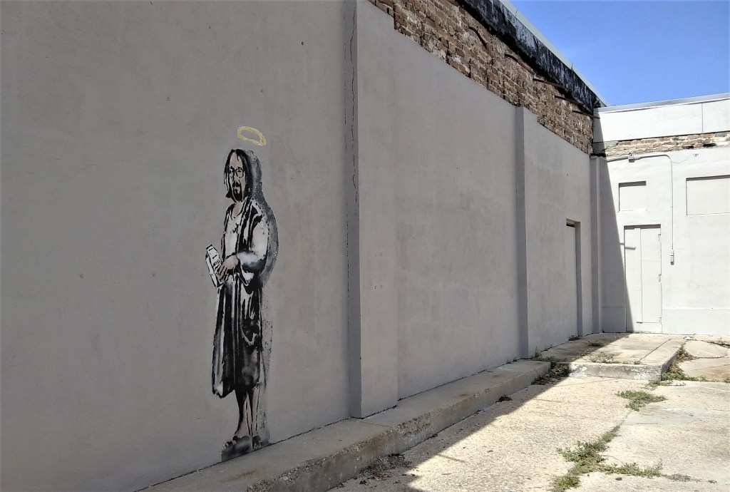 An obscure little downtown corner parking lot features this ambiguous figure. Is it Jesus, or a guy in his bathrobe, holding a quart of milk?