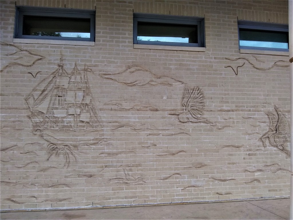Not to be outdone, the Alabama Welcome Center at the Ala-Miss state line features relief work in the bricks of the building. The theme of all the art there is coastal life.