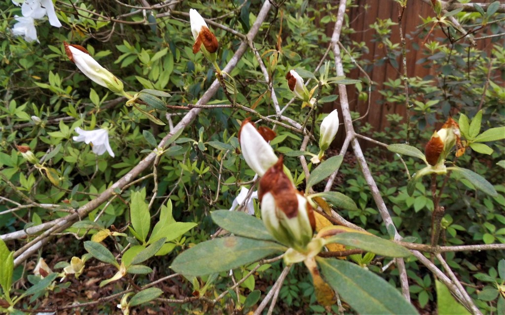 My white azaleas in the back are starting to bloom. The buds show a little brown from being nipped by freezing temps not long ago. They’re okay and will be pretty when they’re all opened up.