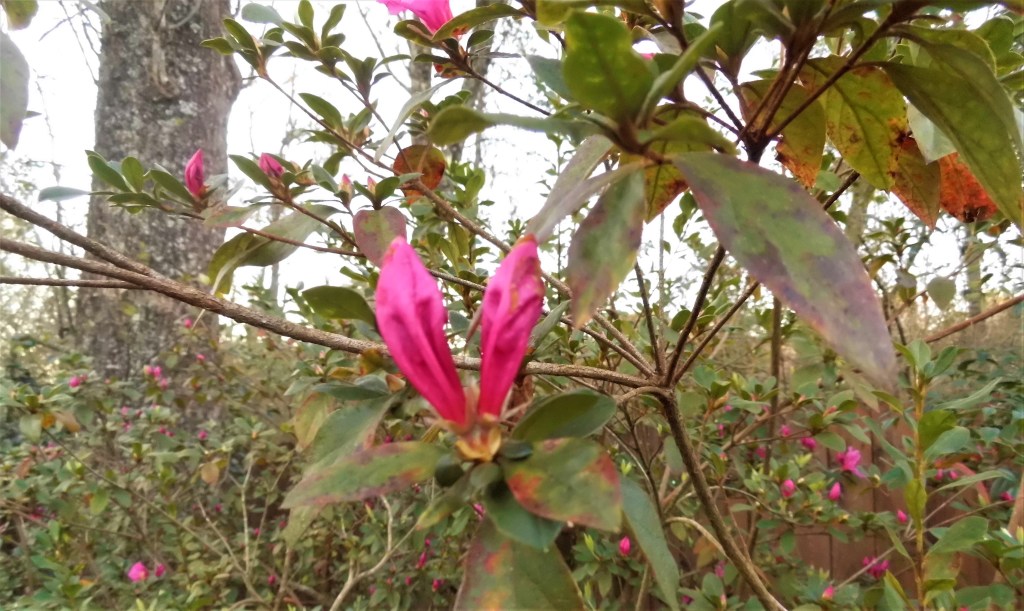 This Pride of Mobile azalea is lagging behind the other backyard azaleas and will be in full bloom a little later. Right now, these buds are just starting to swell. I love the two-toned pink color.