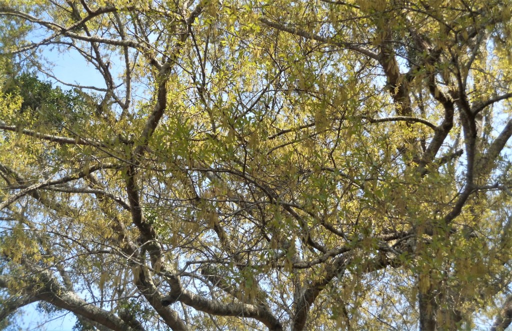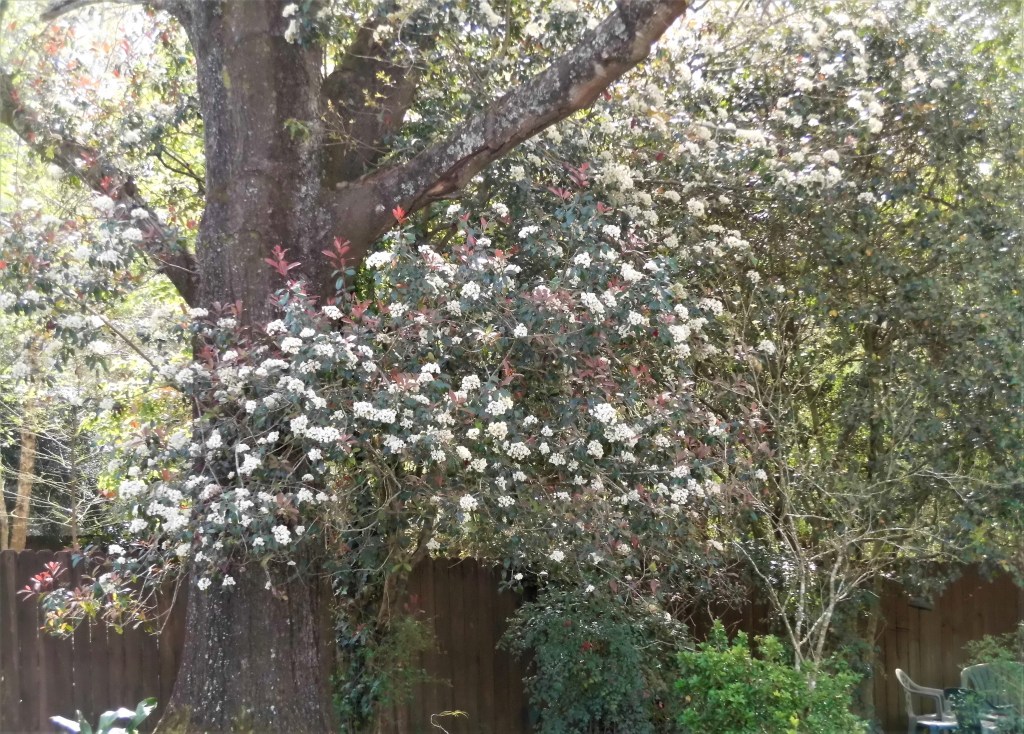 The red-tipped photinas have been blooming for awhile now and are just starting to fade. This one is closer to the fence than the oak you see here, but the branches with blooms reach around the oak trunk to take center stage.