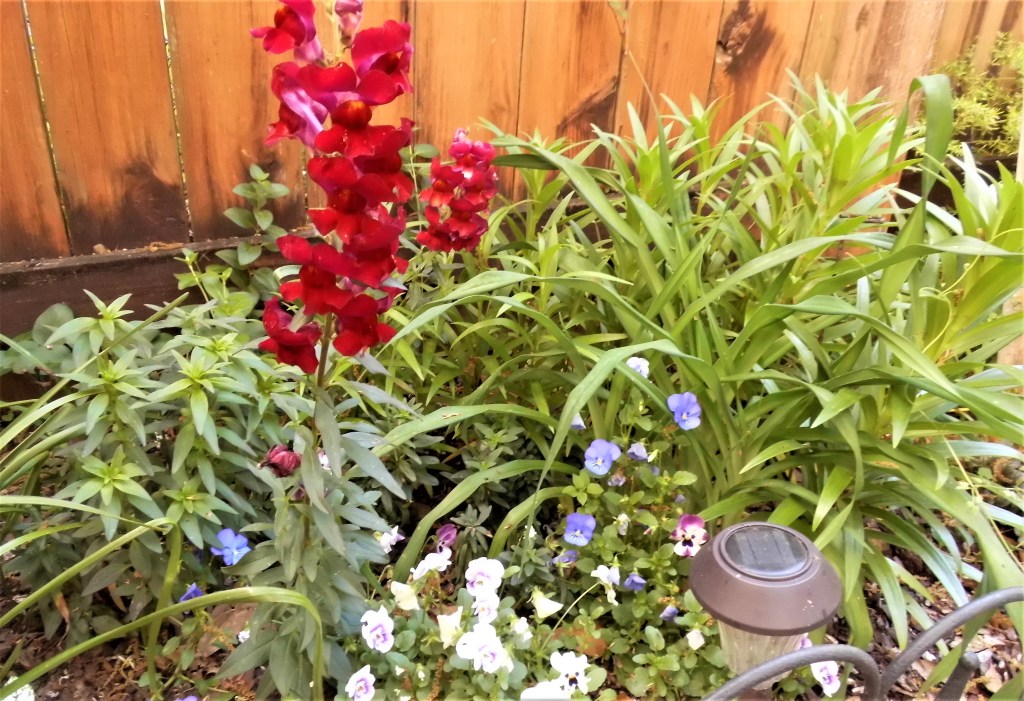 This flower bed is in transition from annual violas, pansies, and snapdragons to some perennials like Easter lilies and daylilies. The hypoestes survived the winter really well as did the begonias. You English gardeners have convinced me to try dahlias in some blank spots in this sunny border.