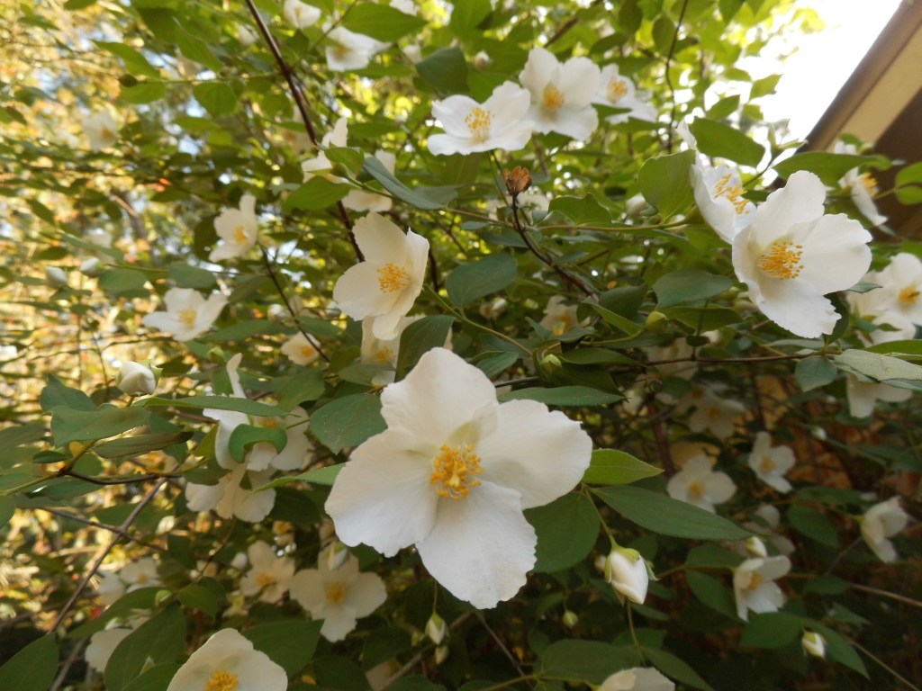 Finally, my english dogwoods are doing so well this year. I think these have the botanical name philadelphus. I’d like to put two more in a couple of spots in the back garden. I like the fountain effect of the branches, the reddish stems, the height, and of course, these lovely white blossoms.