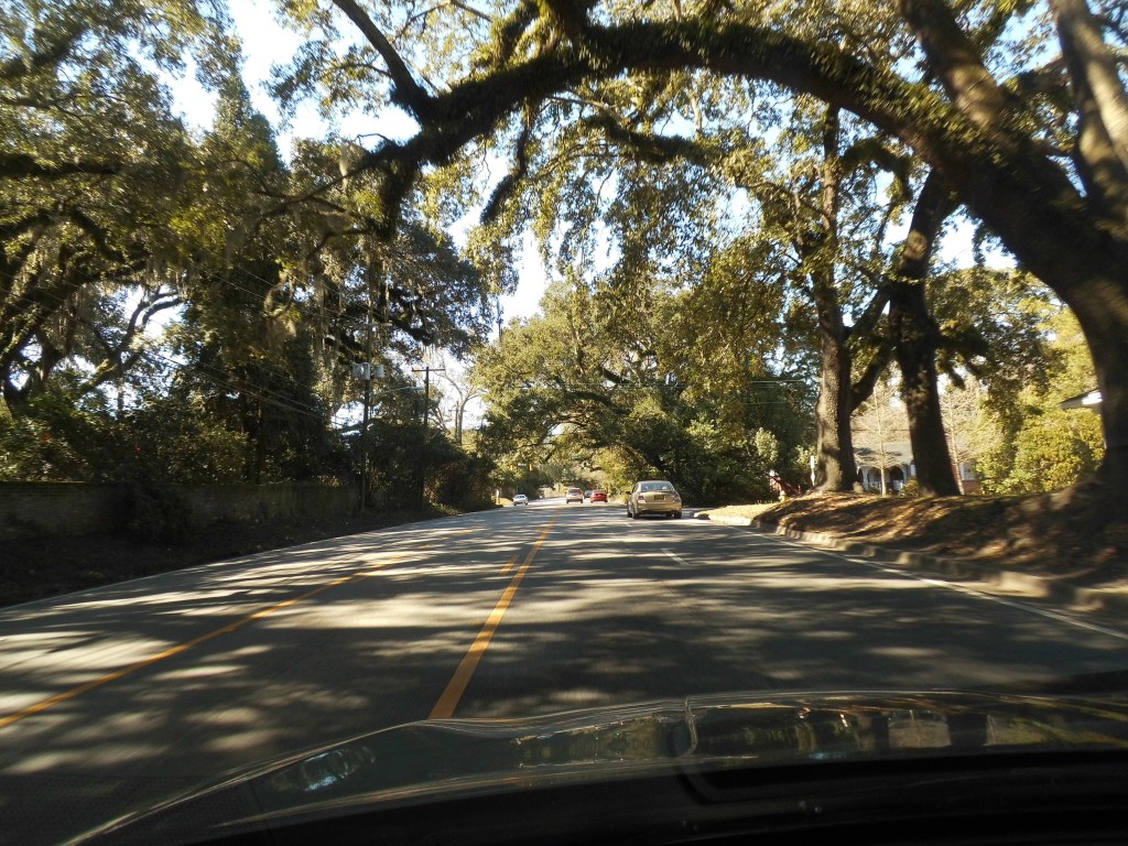 This is a primary thoroughfare, and one of the oldest streets in town. City ordinances prohibit removing the live oaks, and careful trimming must preserve the overarching effect of the limbs whenever possible. Years of pollution have inhibited much of the spanish moss here, but you still see it draping itself on trees in areas that don’t have as much traffic.