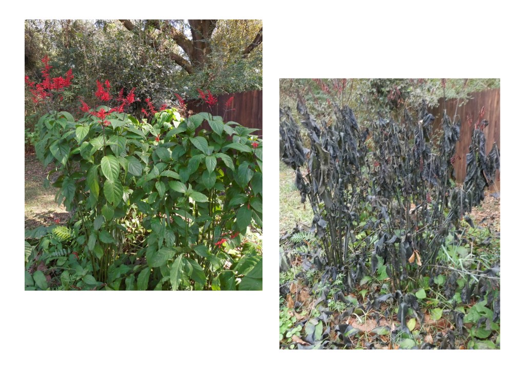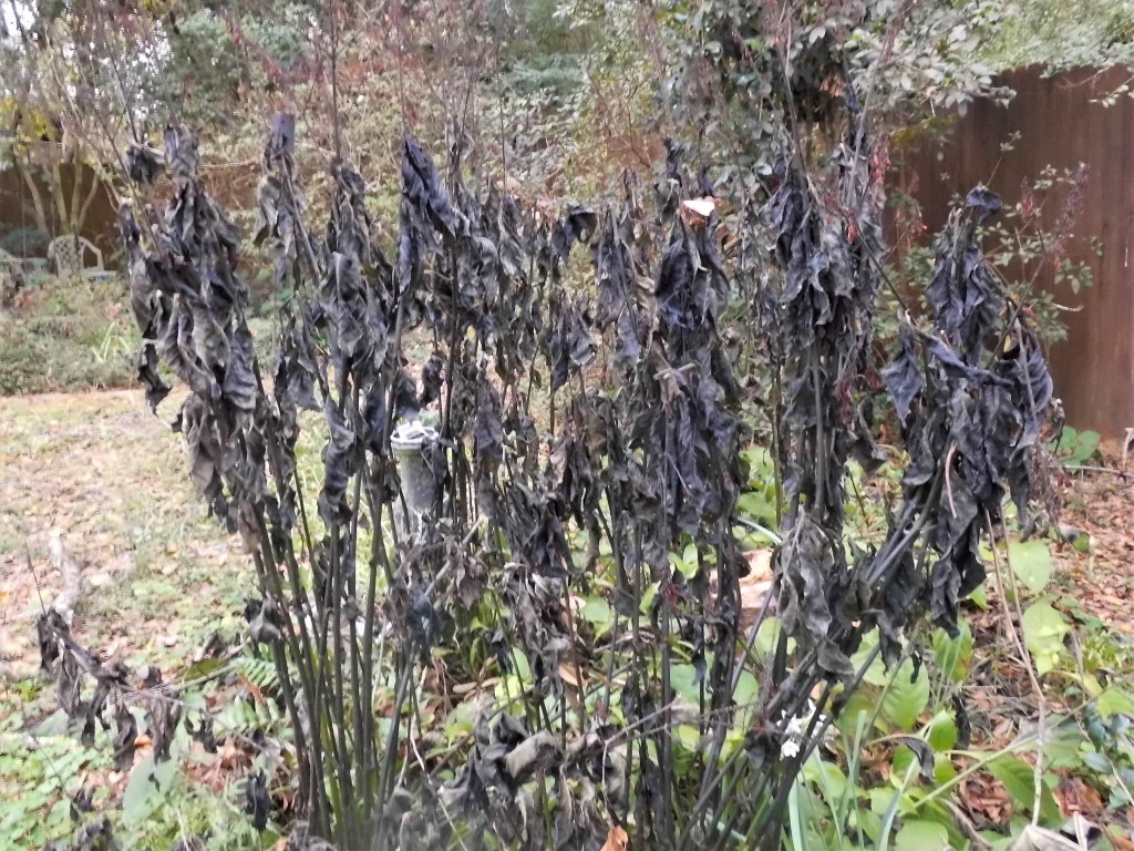 We’ve had a couple of light freezes on the Gulf Coast this month, so my tender perennials are gone for this year. I’m going to leave these as they are until late January or early February, when I’ll cut them back to get rid of the dead stuff. That means at least two months of looking at a shriveled, floppy, discolored mess.