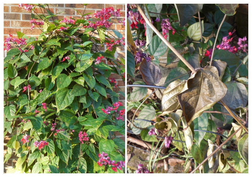 Finally my cardinal spears often bloom until Christmas, and I like to use the red spikes in decorations – not this year. The collage below is before and after the first freeze.