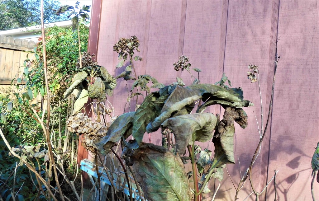 Here’s what I mean. The top picture shows hydrangeas with blossoms and leaves turned brown. The falling oak limbs during our two back-to-back hurricanes battered these poor shrubs already.