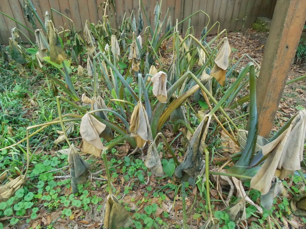 The big patch of elephant ears is gone for this year. These gentle giants have been happy for thirty years in an area near the end of the septic tank’s feeder lines. Booglified! They’re dependable plants, so I know they’ll be back next spring.
