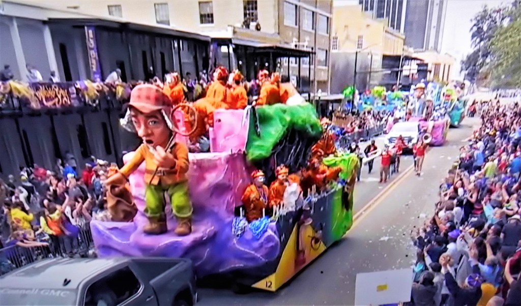 My family is Protestant and not of the upper social class who participate in the machinery of Mardi Gras. I’ve never been to a ball down here or ridden on a float. When the kids were little, we used to take them to the parades for fun, but we stood with the unwashed masses, clamoring for the masked elites on the floats to throw us a few beads, candies, or Moon Pies.