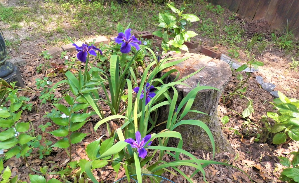 I planted Rocky Hunt in a bed that I’m refurbishing. You can see the stump of an oak that we lost in one of the hurricanes last fall. For now, I’m just going to put a big planter on the stump. The birdbath that has been here for decades lost its top in the same storm. I’ve been looking for another concrete dish since the base is still intact, but no luck yet. I may have to buy a whole new birdbath. This is the bed that was full of the fall-blooming tall, red cardinal spear, but I’ve rearranged them to the back and planted some new things at the front. Oh, and you can see a small new camellia at the top center of this photo too. There is still more to be done here, but it’s a good start.