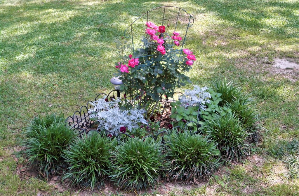 Right in the center of the backyard is this little circle bed where the hot pink rose bush is blooming like crazy. The craziest thing is that there’s a red sport and pale pink sport blooming on this same bush. I also like the effect of the silvery dusty miller flanking the shrub.