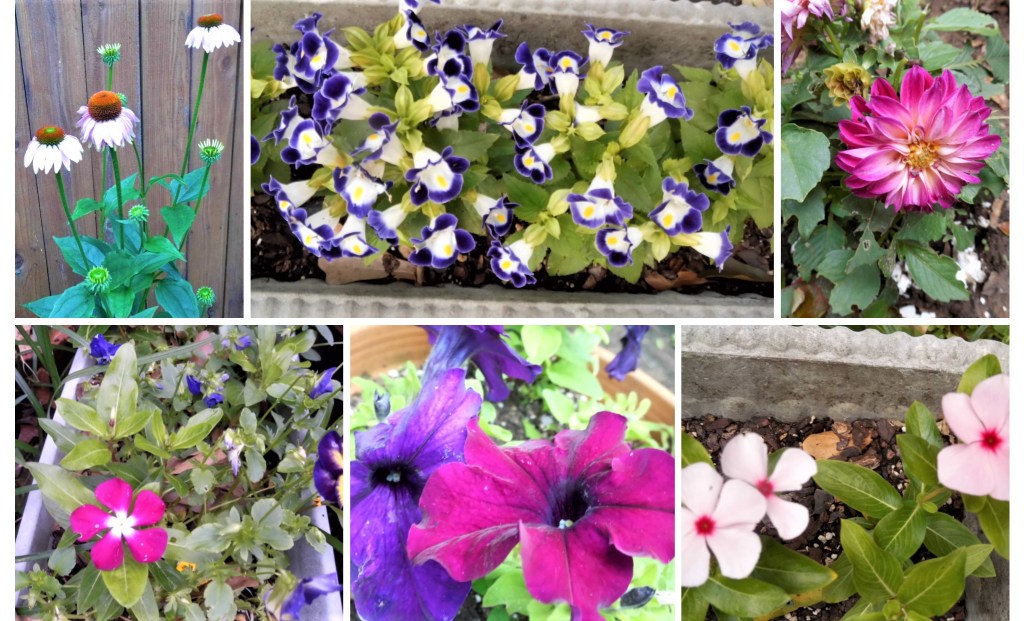 Today’s blog is a quick one. I’ve grouped six photos of pinks and purples growing now in my garden beds and planters. When you look at the big picture of our yard, you see lots of green. To find the colorful bright spots, you have to walk around and search out the colors.
