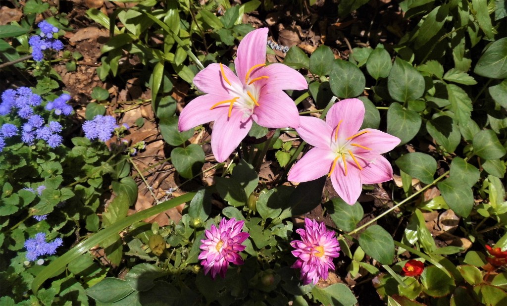 We can start with pretty pictures, like the top photo of two pink rain lilies. These flowers pop up intermittently after a good shower. Zephyranthes grandiflora are small bulbs that are easy to forget about, but they’re a wonderful surprise when they show up.