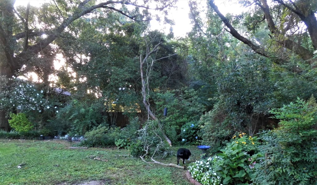 I recently said I’d try to do a panoramic view of the backyard, so here’s the result. It’s not wide enough to include the far-right/west part of the garden and patio, but it meets my goal. I wanted to show the althea on the left, the bed at the back center, and the gardenia on the right. Pardon the big, dead limb hanging at the top. We’re not sure how to get it down. I’m glad I took this picture early in the week because of the next picture.