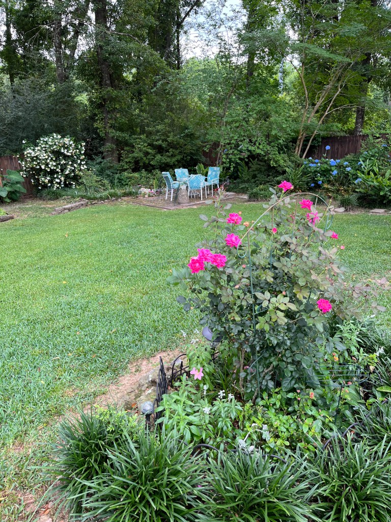 Lastly, my knockout rose is getting a second wind after its first flush of blooms from April died back. Behind the rose bush, you see the gardenia is still blooming, and blue hydrangeas are really showing out.