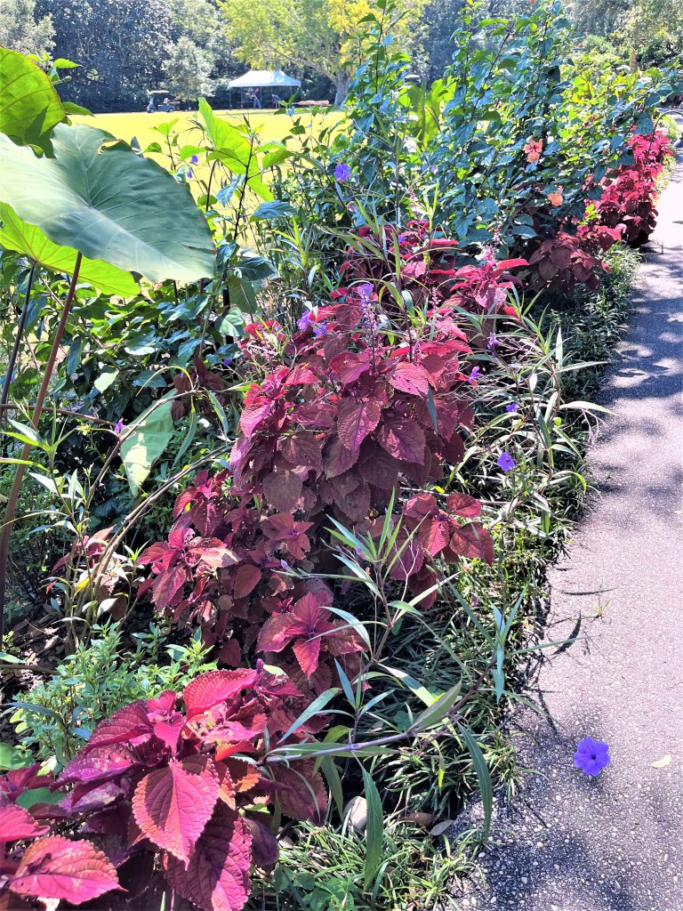 Further into the gardens, flower beds line pathways with colorful flowers and foliage. It’s almost sensory overload when you try to see everything. For example, this strip contained purple tibouchinas, peach-colored hibiscus, and red coleus. You might not think that would be a good combination, but it was lovely.