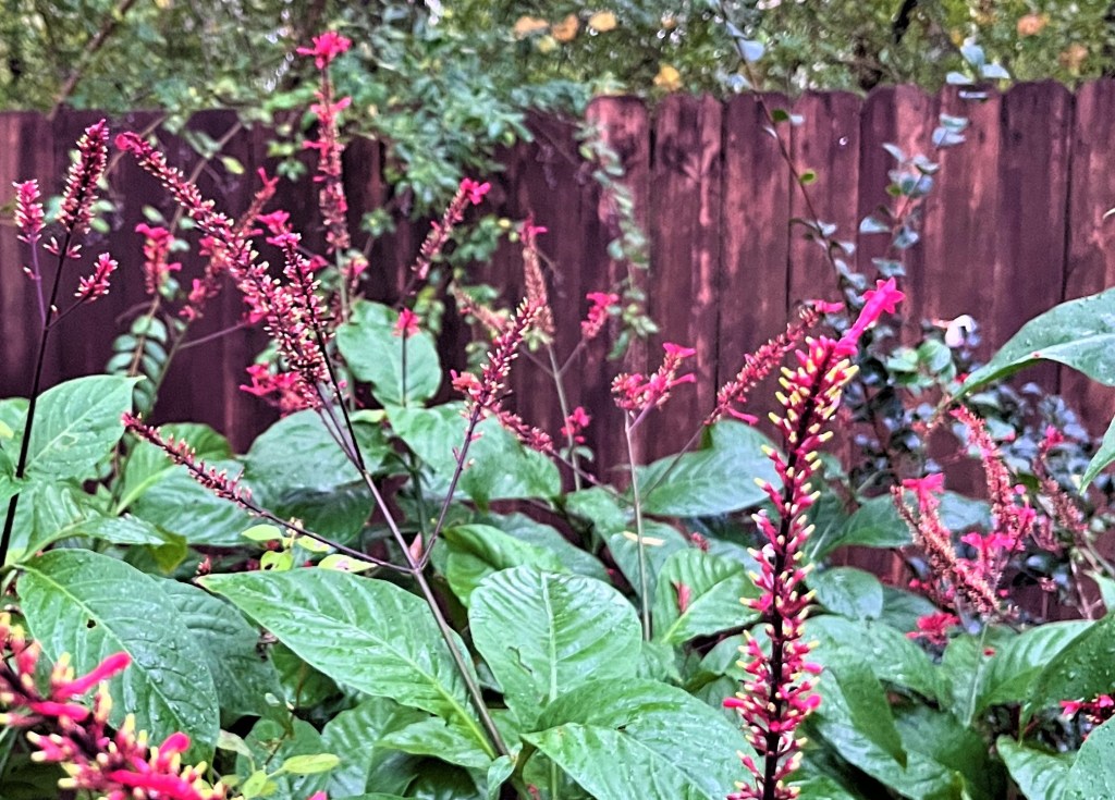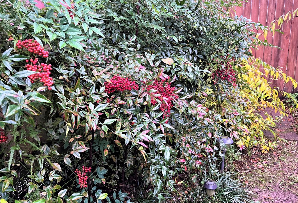 TOP PHOTO. Here are some nandinas with their red berries in the top photo. And you see the forsythia’s yellow autumn leaves peeking from around the corner. In the past couple of days, I’ve finally seen more changing leaves in our area. However, we mostly have evergreens or leaves that turn brown and litter the ground.