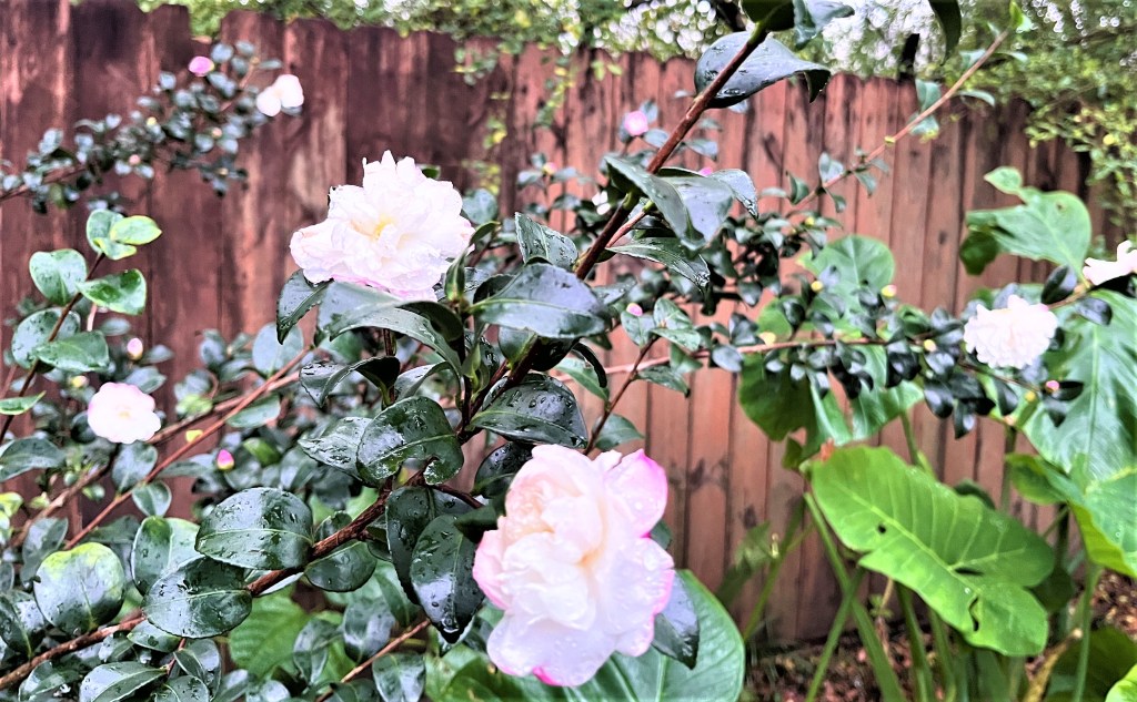SECOND. More white sasanqua blooms are filling this back shrub.