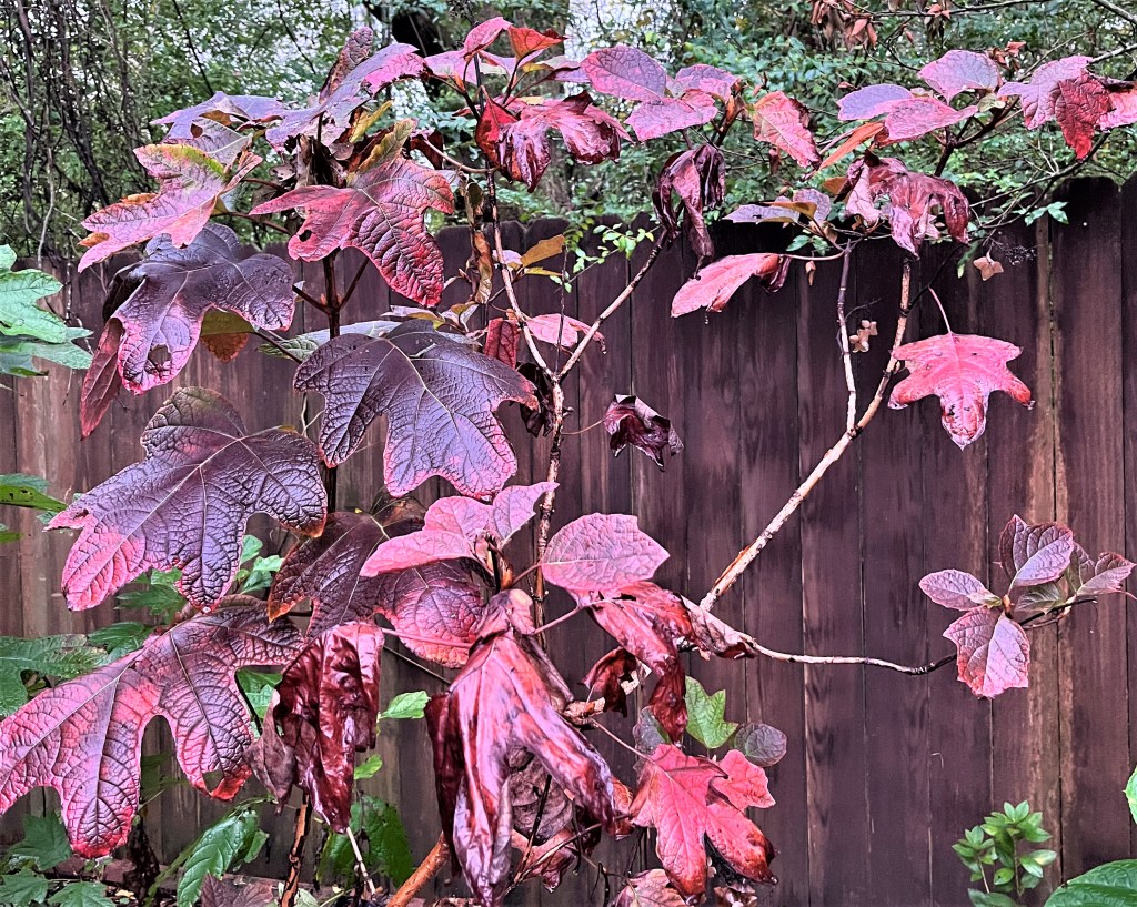NEXT. A section of my oakleaf hydrangea has turned to shades of maroon and crimson, but the other half still has green leaves. What’s that about?