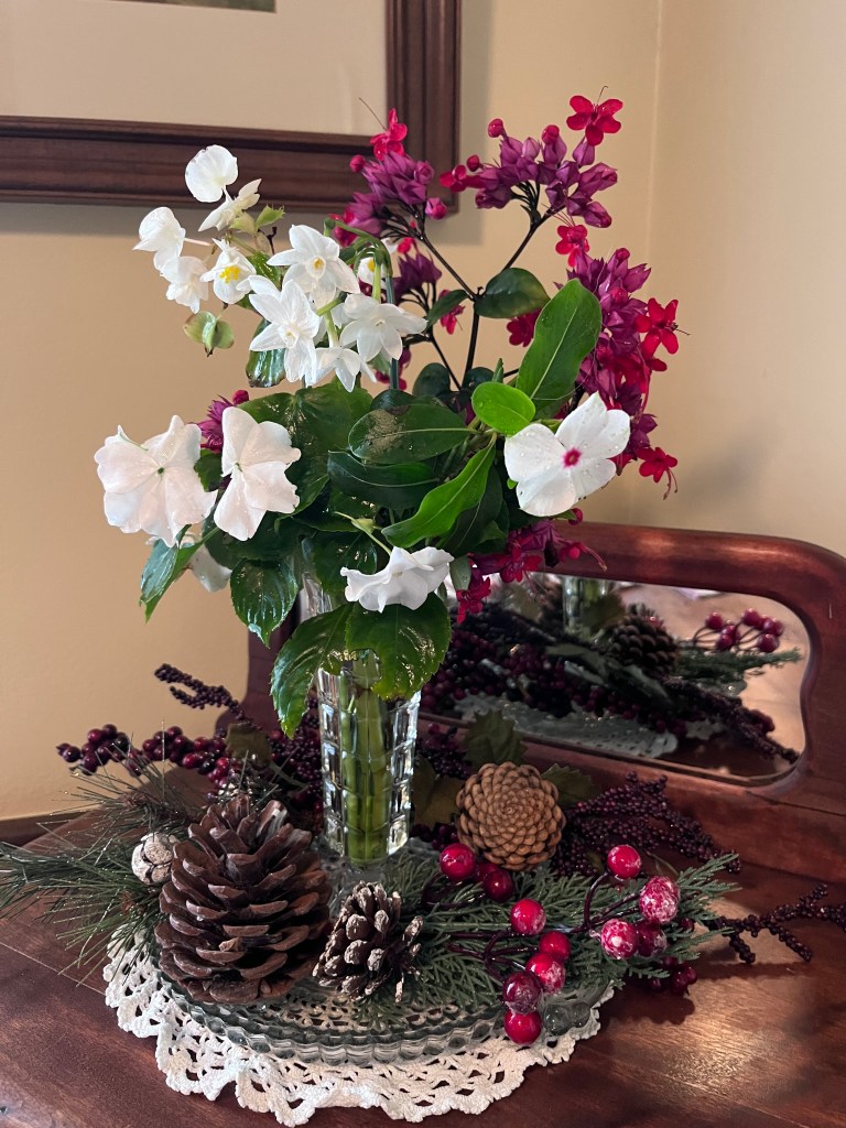 Last week, the Winter’s first paperwhite narcissus bloomed. I cut it for a little arrangement with some bleeding heart, impatience, begonia, and one little vinca (periwinkle). Colder temps are starting to move in, so these tender annuals will be dead pretty soon. In the meantime, the colors are nice for a temporary seasonal arrangement.