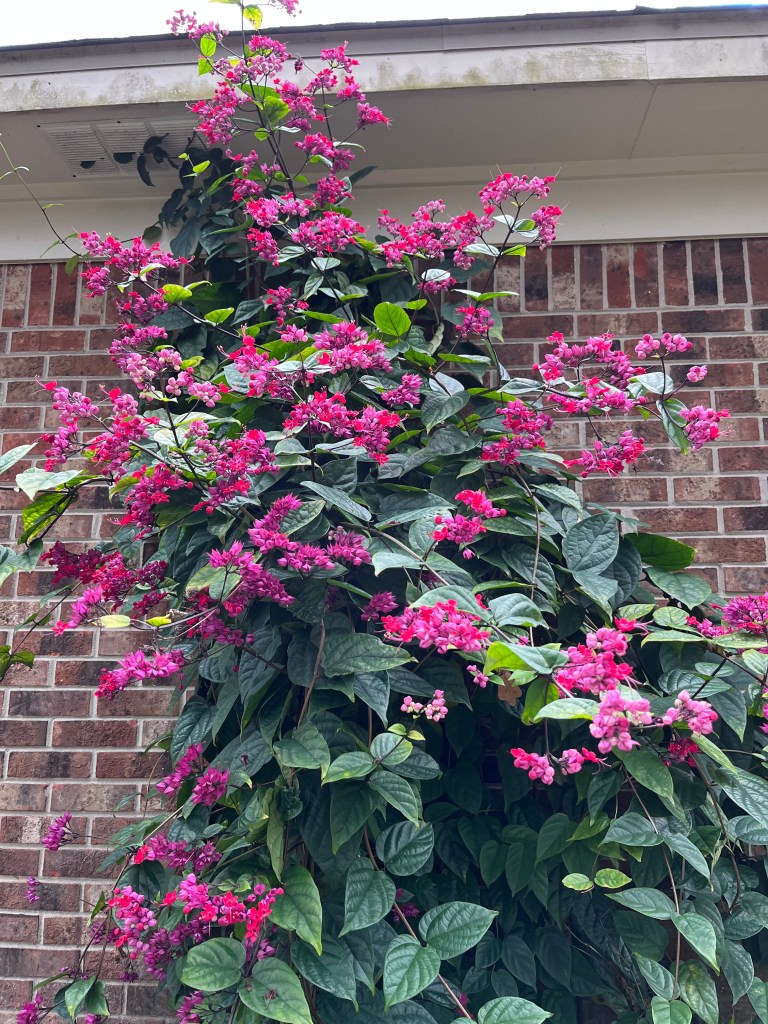 And this tall bleeding heart vine has been spectacular! You see it reaches the rooftop with flowers covering the whole plant.