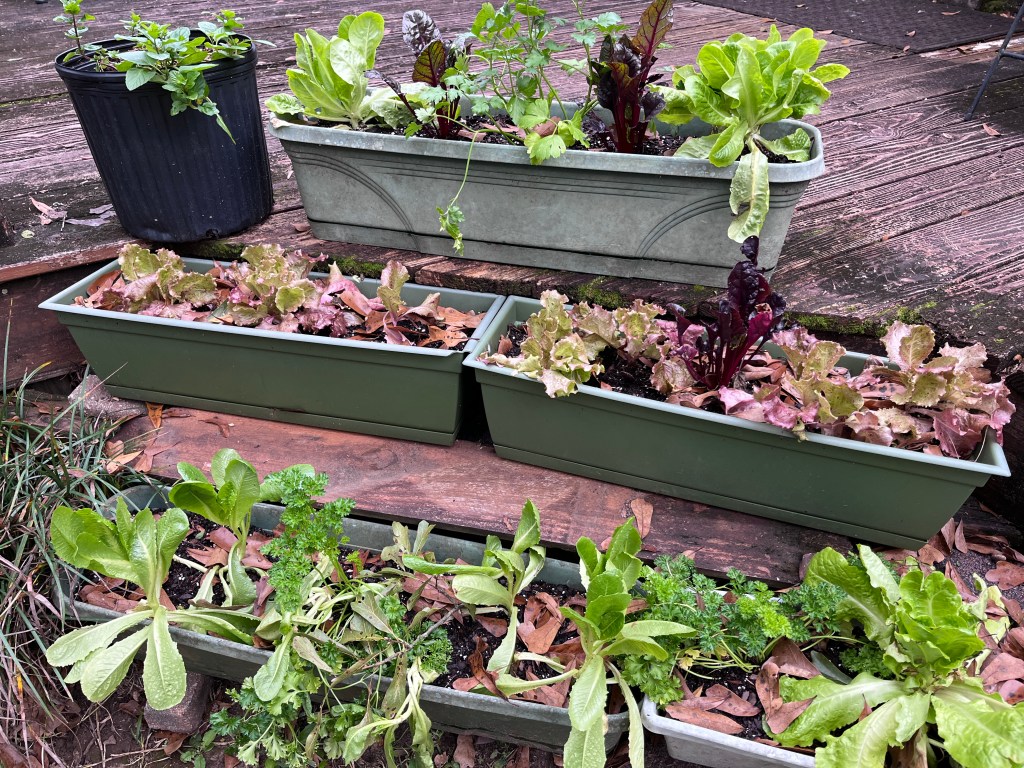 Here is my Winter salad garden. I couldn’t plant the lettuces, herbs, and chard in my usual spot. We’re still waiting on a guy to replace the deck, and I didn’t want to disturb my veggies if he comes anytime soon. (Hope springs eternal.)