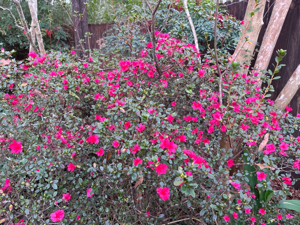 Christmas Cheer is the name of these three Kureme azaleas. I’ve had them for about 30 years, and they’ve never bloomed at Christmastime – until this year. I’m delighted, but the recent weather has them so confused since they’re usually Spring bloomers.