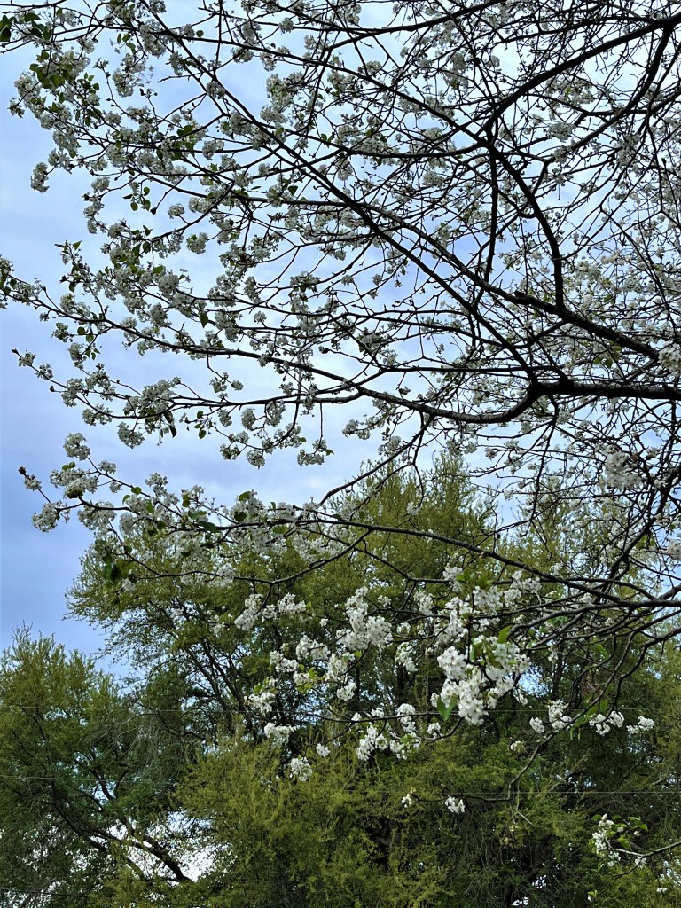 The ornamental crabapple in the front yard has been beautiful, but I didn’t take a picture on a good, bright, blue-sky day for you. Leaves are now forming, and the little white flower petals are floating away on the wind. It looks like snow flurries in our yard, without the slush.