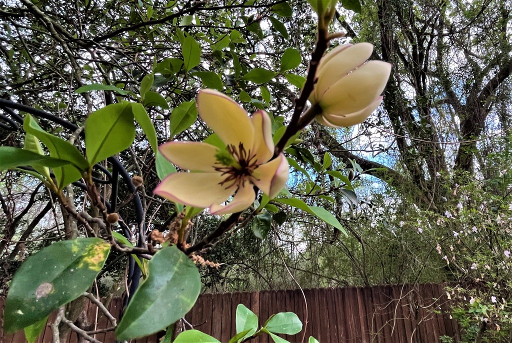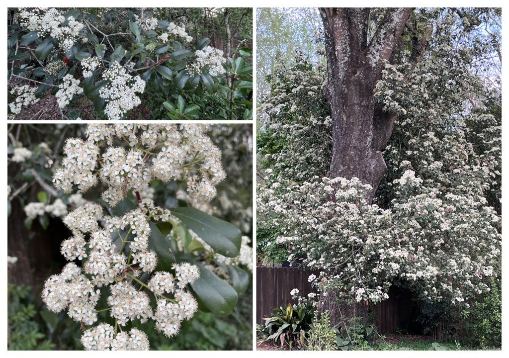 Near the banana shrub, I’ve let a photinia become totally unruly. With unchecked growth, it has wrapped its lanky limbs around the oak tree. But that brings the spring blooms into full view in a spectacular display.