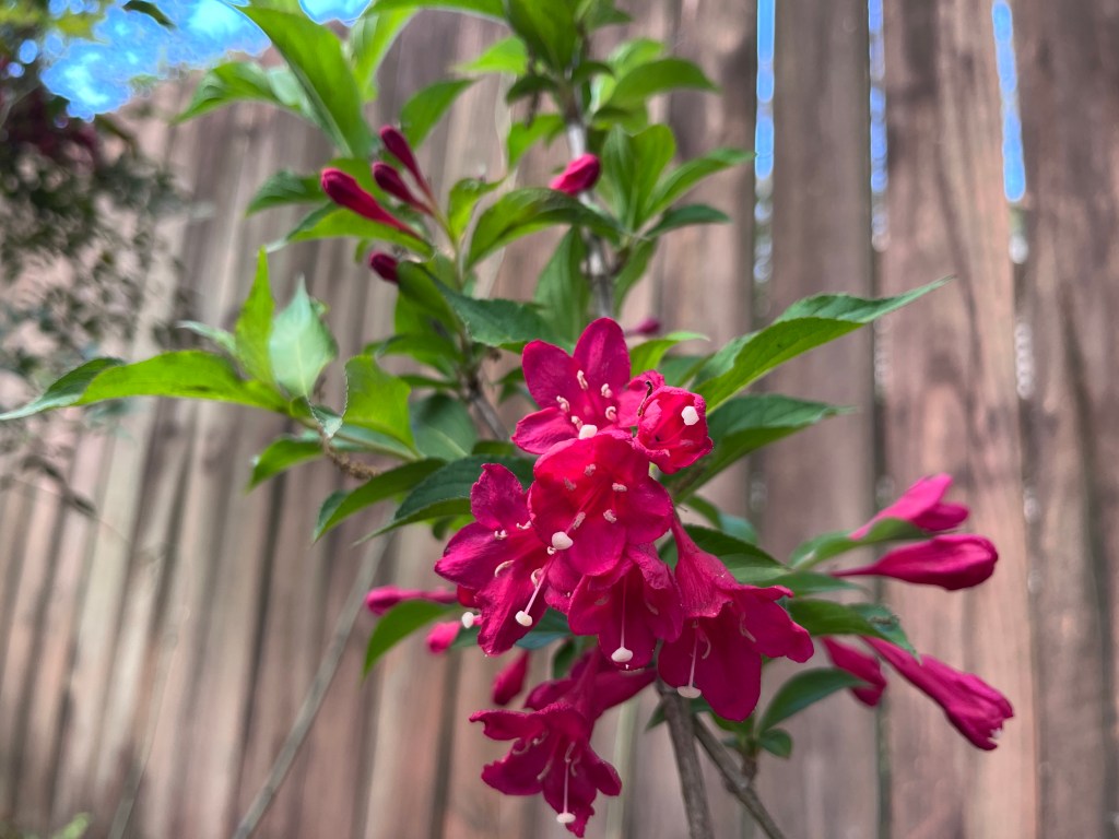 Continuing up the east side of the yard, I’m thrilled with a little weigela I planted last year. My brother rooted it from one of his shrubs and gave it to me in November of 2021. It has been in the ground for almost a full year but hasn’t grown much. I love these cherry red blossoms, so I hope the shrub is happy in its new home.