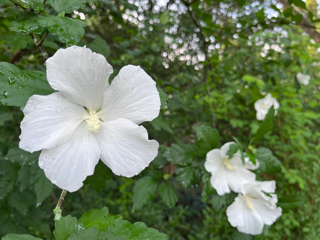 The top photo is an althea, or as some call it, rose of Sharon. I have this solid white kind and another two-toned purple one. Granny had a white one with a fuchsia center. I’ve seen those in other people’s gardens and wanted to ask for a cutting, but I haven’t so far. This tall white shrub has a long blooming season, well into the summer.