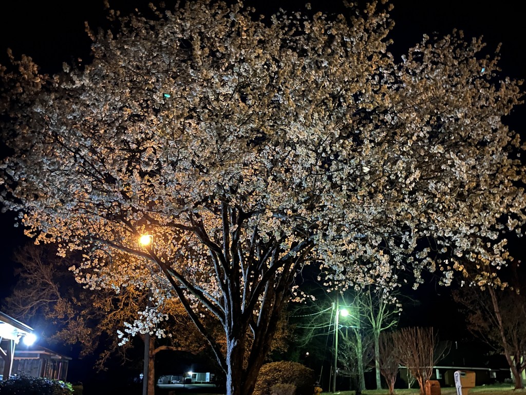 Our flowering crabapple was glorious in early March. At night, the white flowers shimmered in the light.