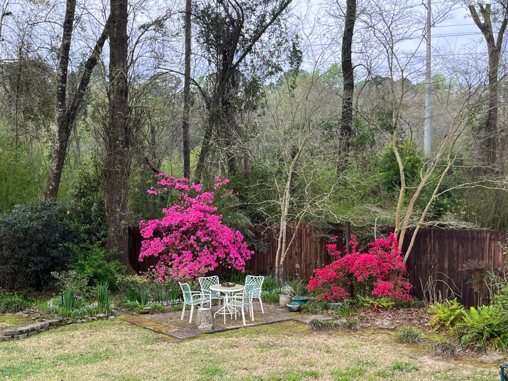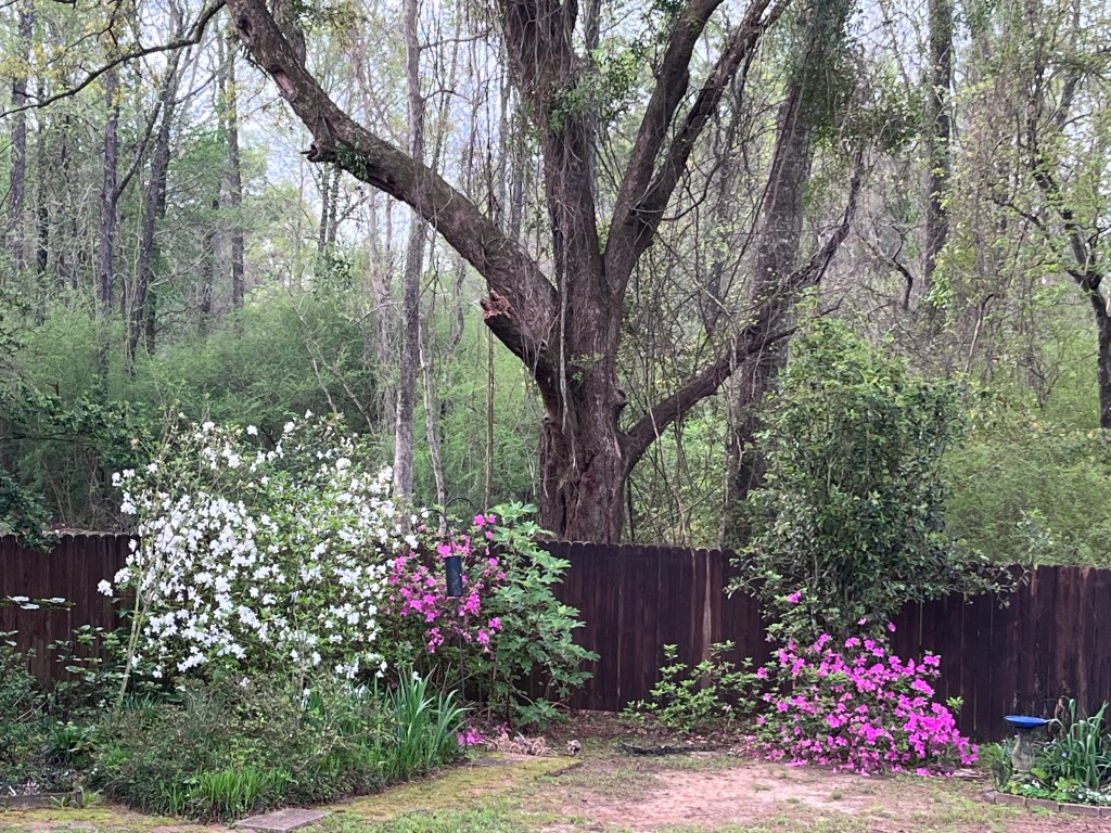I’ll give you the broad views of the backyard since many of the large indica azaleas were blooming at about the same time. The southeast corner has changed since I lost a couple of big azaleas there, and we have a few years to wait for the replacements to become showy.