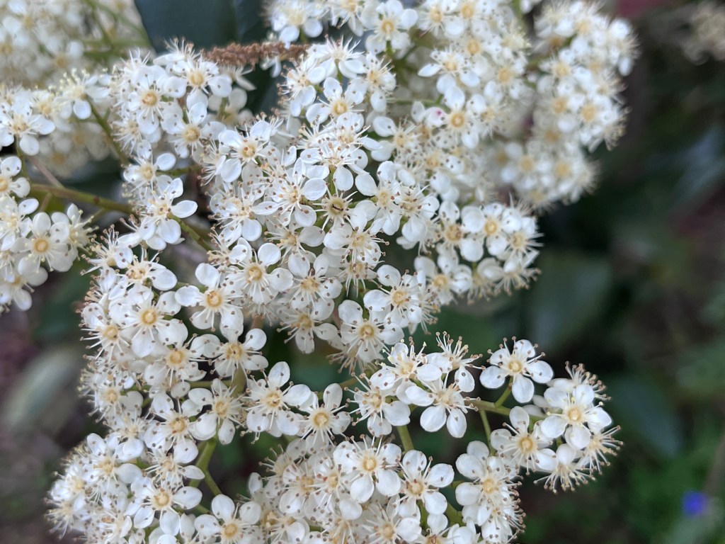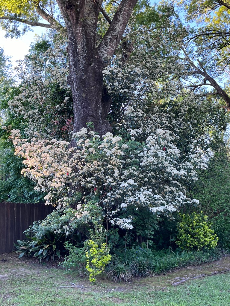 The photo of my sitting corner shows the overgrown red-tipped photina in full bloom at the top left corner. Just above, I’ve shown a fuller shot of that same shrub.